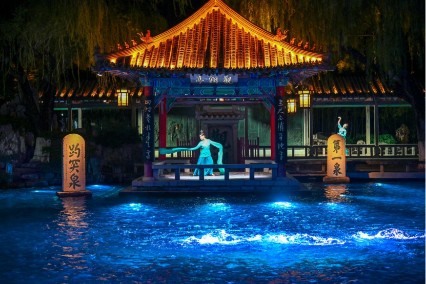 据悉,国庆中秋假期,济南趵突泉景区推出沉浸式夜游项目《趵突夜画》。当夜幕降临,《趵突夜画》以“二安”文化为脉络,借助光影科技,将诗词、歌舞与泉水融为一体,让古老的泉池变成了一个沉浸式的文化梦境,更让本地文化IP在与时俱进的创造性转化中,焕发出更迷人的光彩。